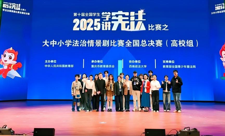 近日,由教育部主办、重庆市教育委员会承办、西南政法大学协办、教育部全国青少年普法网支持的第十届全国学生“学宪法 讲宪法”大中小学法治情景剧全国总决赛在西南政法大学顺利落幕。重庆市共派出3个代表团队参赛,我校参赛团队凭借其精心编排、底蕴深厚的情景剧作品《忠魂不朽 法护千秋》,在激烈的全国角逐中脱颖而出,荣获全国总决赛三等奖,实现了在全国学生“学宪法 讲宪法”系列活动国赛中零的突破,为学校赢得了荣誉。